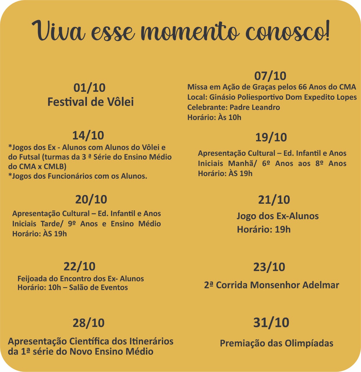 Este ano, em virtude das comemorações de sua fundação, o Colégio realiza uma diversificada programação, que aborda duelos educativos, ações culturais e esportivas, além de atividades criativas e dinâmicas envolvendo a escola e a família em momentos de interação, conhecimento e muita diversão.