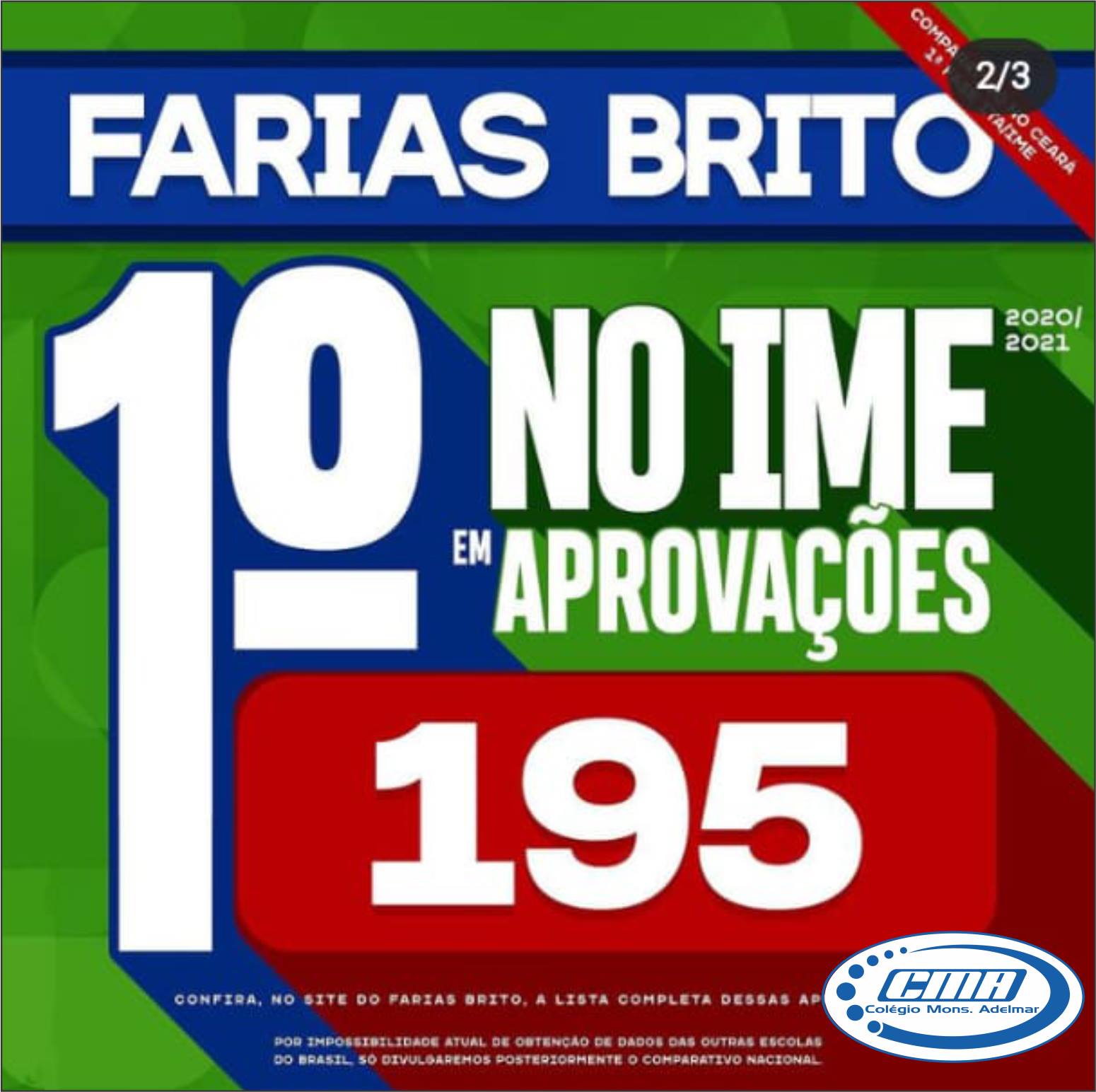 Super User Destaques 03 Dezembro 2020 Acessos: 1876 O Farias Brito é 1º em aprovações na 1ª fase dos vestibulares ITA/IME. FB parceiro CMA! Por favor, avalie Votar 1 Votar 2 Votar 3 Votar 4 Votar 5 View Comments View the discussion thread. back to top Artigo anterior: COMPRE SEU FARDAMENTO ATÉ 20 DE DEZEMBRO Anterior Próximo artigo: Matrículas Promocionais Próximo