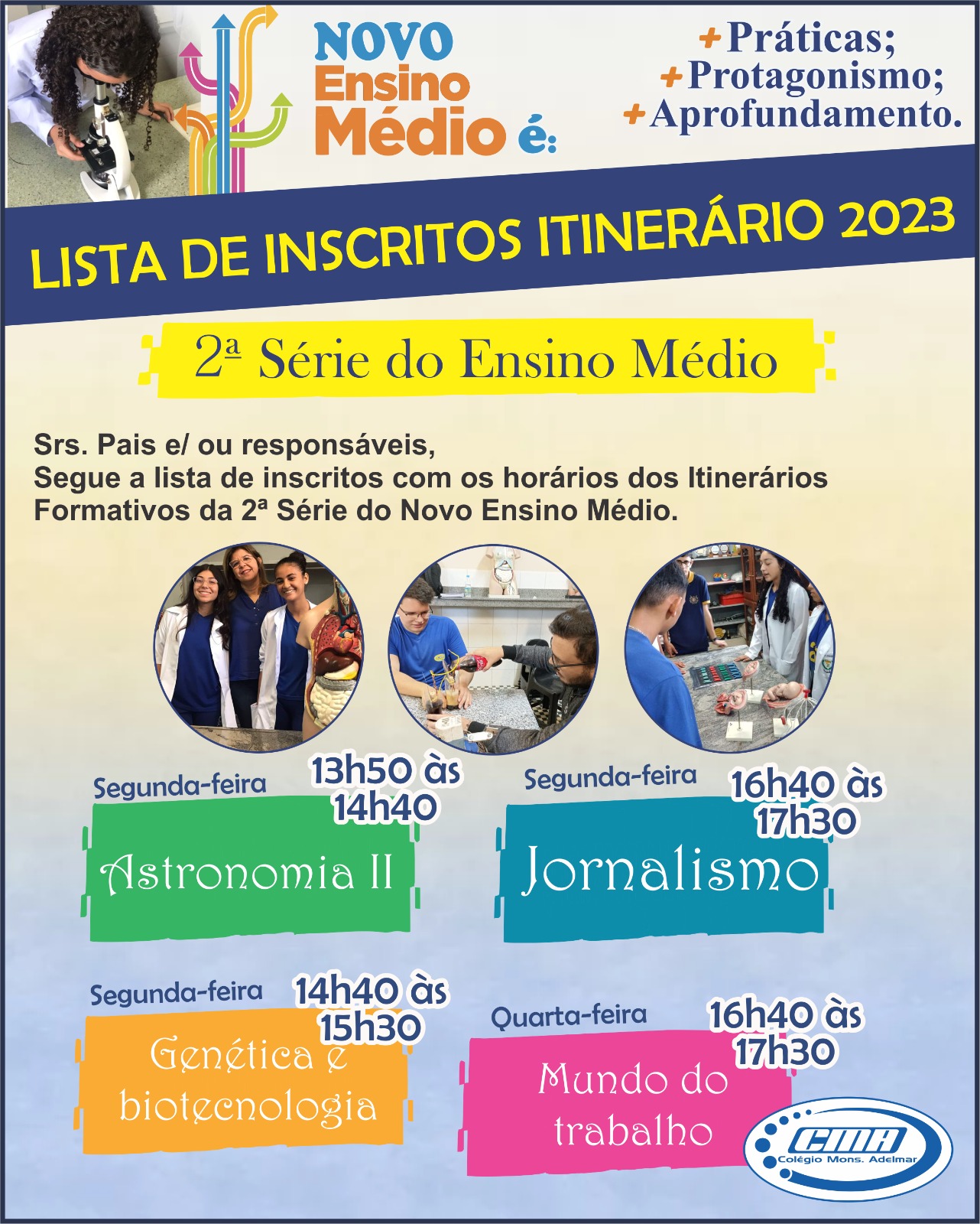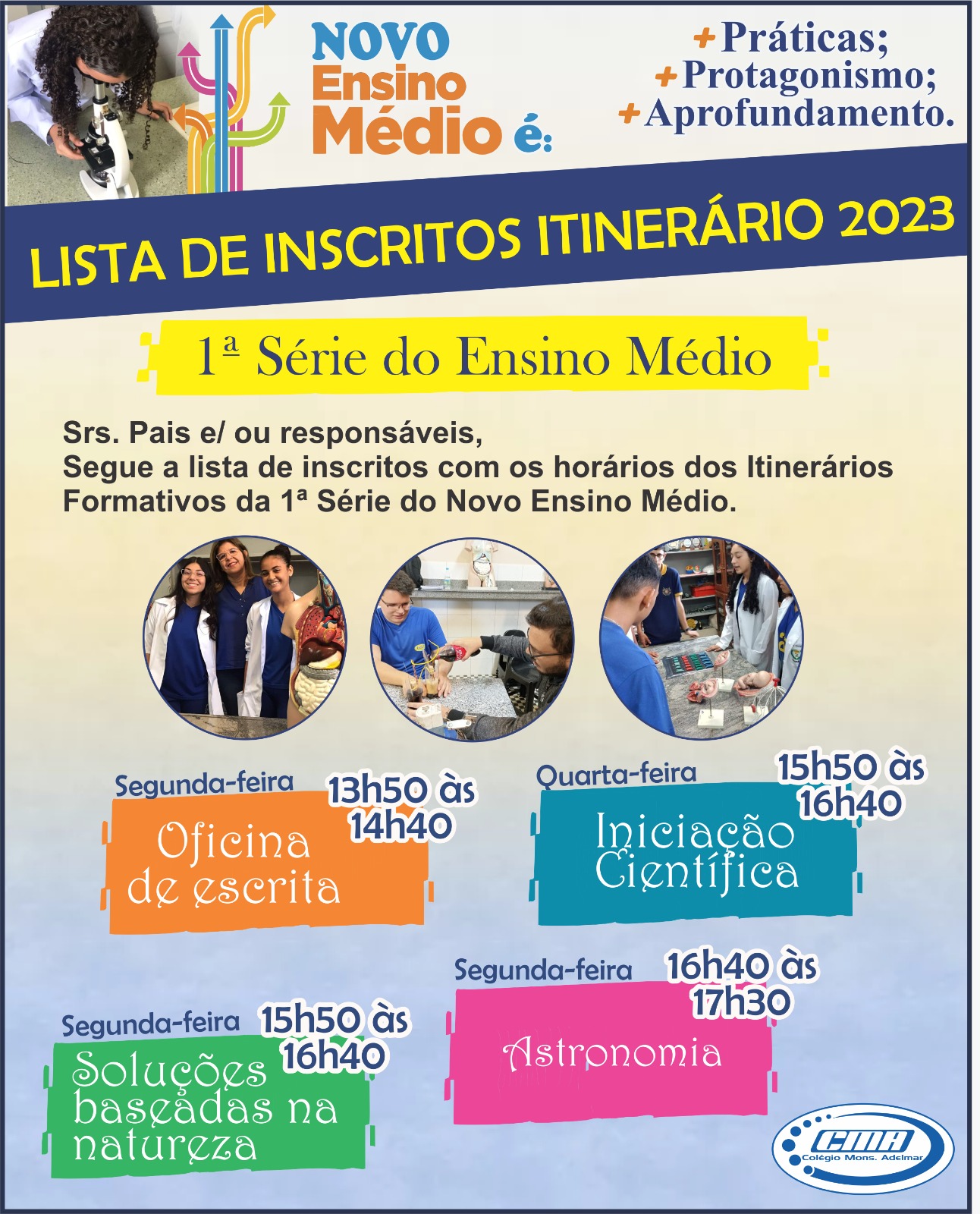 Super User Destaques 05 Março 2023 Acessos: 1767 Lista de Inscritos Itinerário 2023 - 1ª Série do Ensino Médio Add a comment Leia mais...