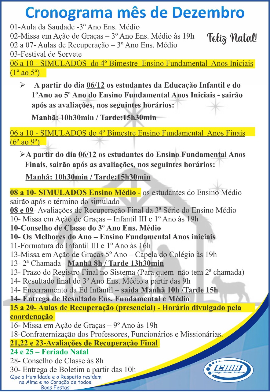 Super User Destaques 04 Dezembro 2021 Acessos: 1196 Missa de Ação de Graças do 3ª Série do Ensino Médio celebrada pelo Pe. Tony Add a comment Leia mais...