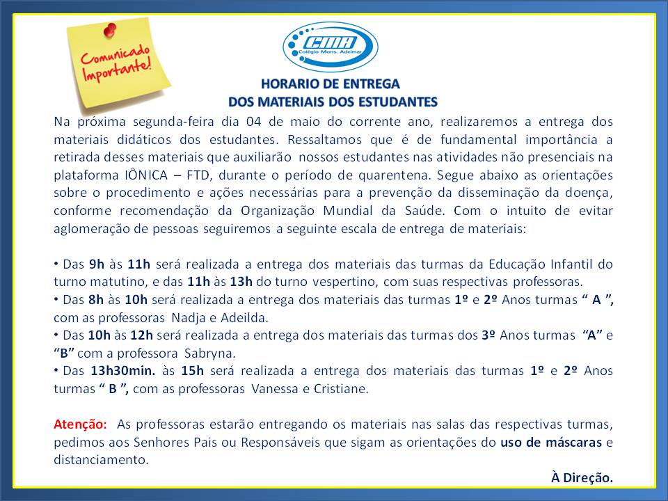Super User Destaques 01 Mai 2020 Acessos: 1348 HORÁRIO DE ENTREGA DOS MATERIAIS DOS ESTUDANTES Add a comment
