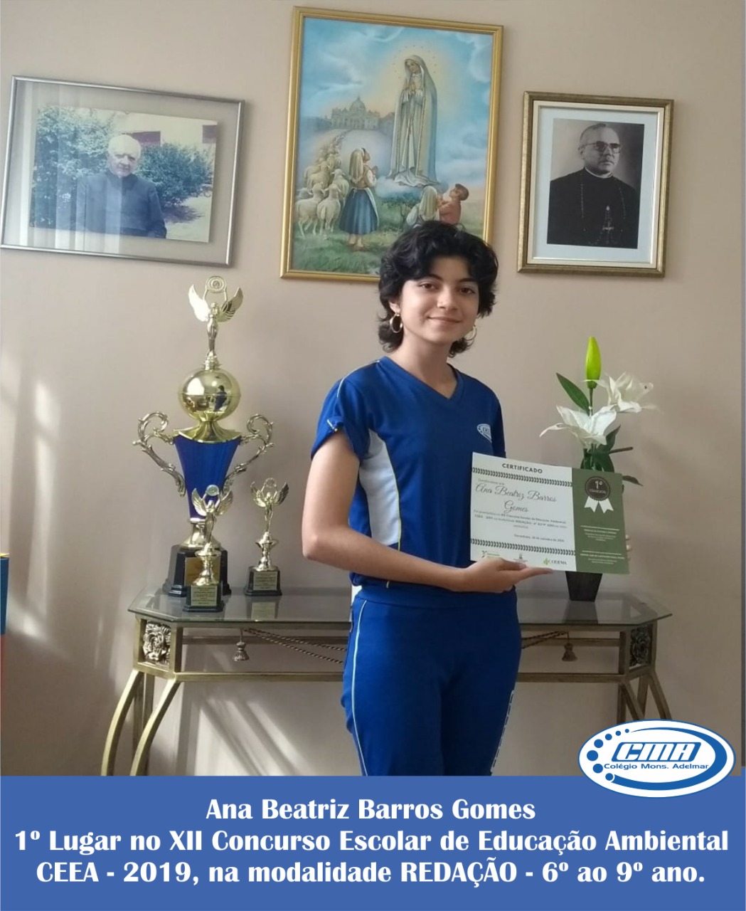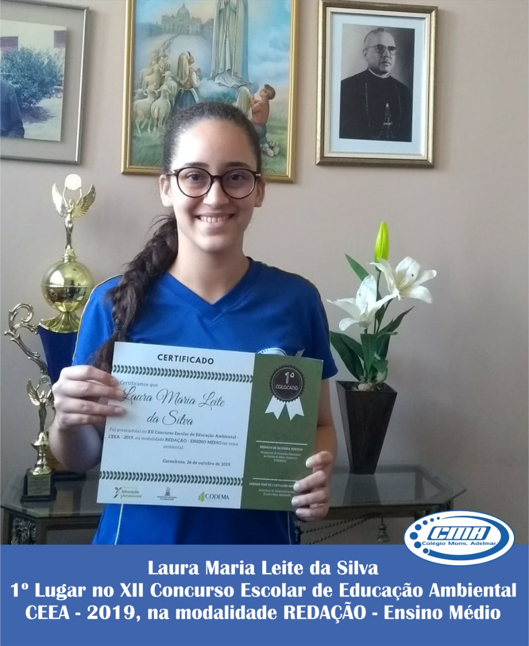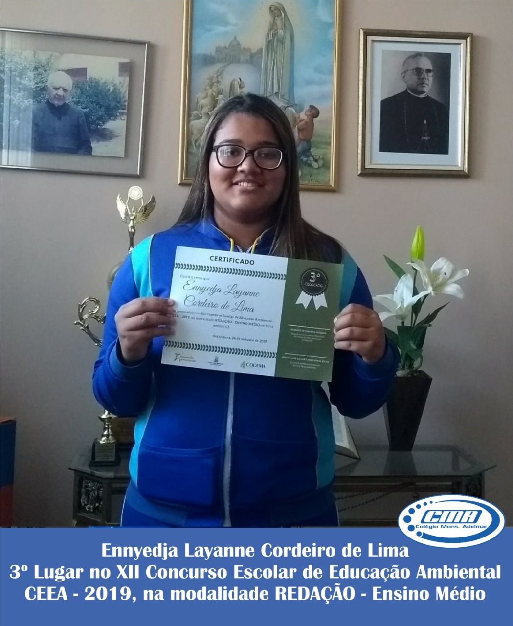 O Colégio Monsenhor Adelmar da Mota Valença (CMA), parabeniza as estudantes: Laura Maria Leite da Silva (1º lugar) e Enyedja Layanne Cordeiro de Lima (3°lugar), pela premiação no XII Concurso Escolar de Educação Ambiental (CEEA/ CODEMA), na modalidade redação. A estudante, Ana Beatriz Barros Gomes foi mais uma de nossas alunas premiadas no XII Concurso Escolar de Educação Ambiental - CEEA - 2019, na modalidade REDAÇÂO - 6º ao 9º ano em tema Ambiental. Parabéns também aos nossos professores, participantes do processo de ensino e aprendizagem, sempre possibilitando aos nossos estudantes as mais variadas oportunidades de acesso ao saber. Nosso Colégio sempre deseja sucesso e conquistas na vida de nossos alunos, por isso dedica-se constantemente em aprimorar o ambiente escolar e qualificar o ensino dentro da instituição, para que cada vez mais estudantes possam alcançar seus objetivos de formação acadêmica e, com isso, chegar às profissões de seus sonhos. Este é o CMA, desenvolvendo as habilidades do seu filho para um futuro de conquistas