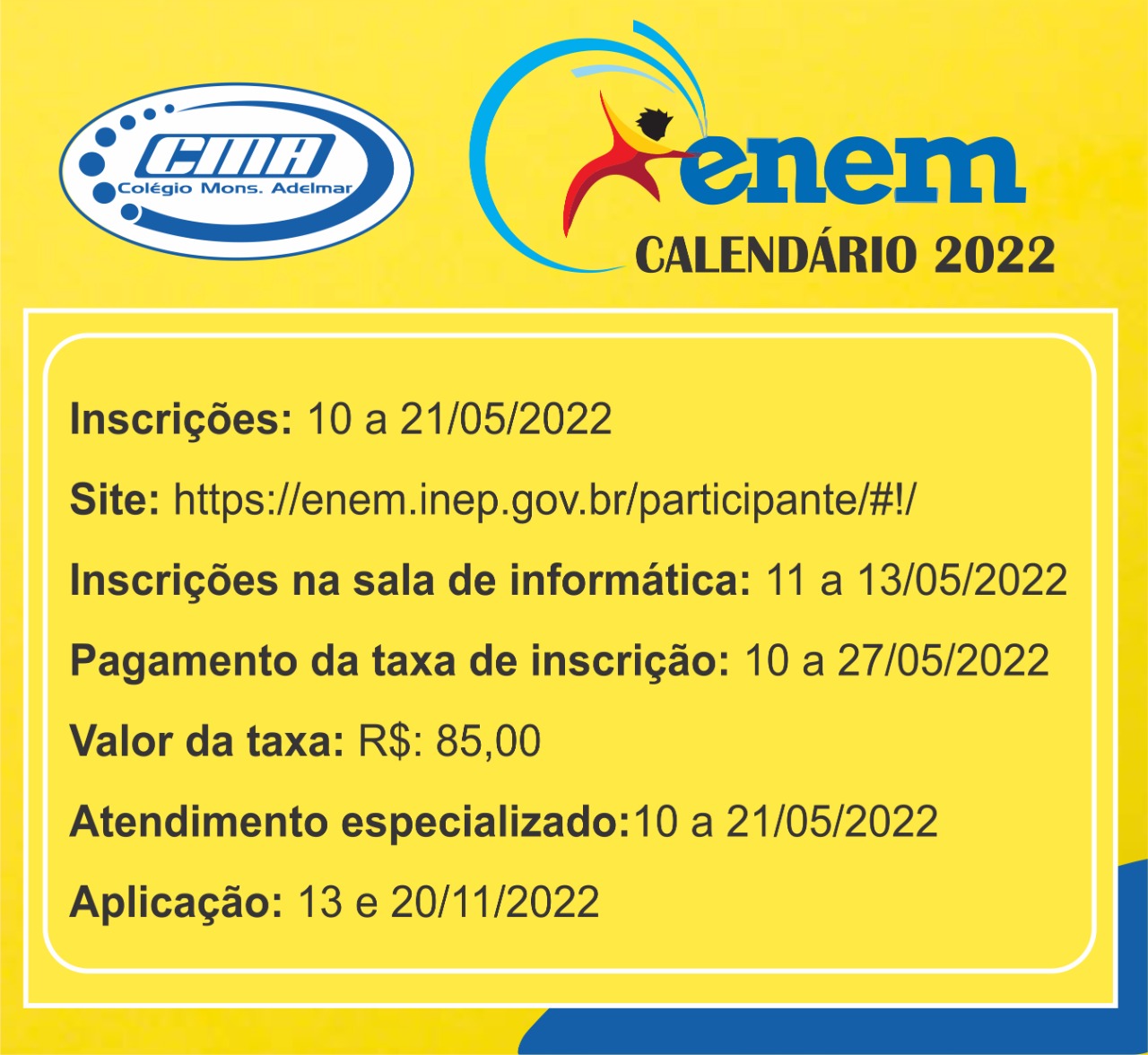 Super User Destaques 03 Mai 2022 Acessos: 1925 Atenção estudantes do Ensino Médio Por favor, avalie Votar 1 Votar 2 Votar 3 Votar 4 Votar 5 View Comments O INEP divulgou as datas de inscrição e aplicação do Enem 2022. Fiquem atentos para não perder os prazos. ? View the discussion thread. back to top Artigo anterior: PROGRAMAÇÃO - III TRÍDUO DE NOSSA SENHORA DE FÁTIMA Anterior Próximo artigo: CRONOGRAMA MAIO 2022 Próximo