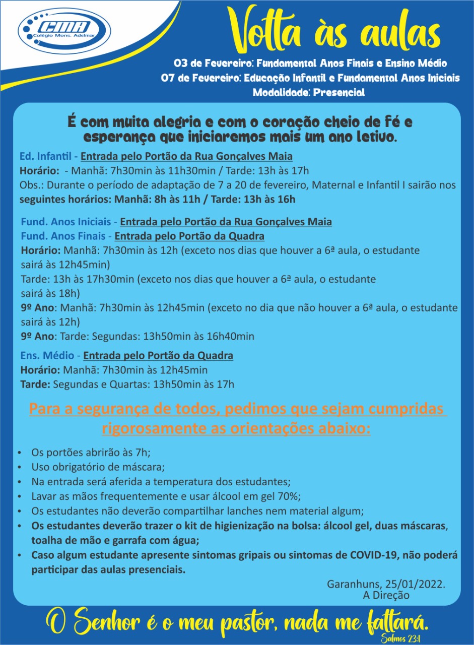 Super User Destaques 25 Janeiro 2022 Acessos: 1405 INFORMATIVO - VOLTA ÀS AULAS Por favor, avalie Votar 1 Votar 2 Votar 3 Votar 4 Votar 5 View Comments View the discussion thread. back to top Artigo anterior: ATENÇÃO ESPECIAL !!! Anterior Próximo artigo: COMUNICADO - PAIS OU RESPONSÁVEIS Próximo