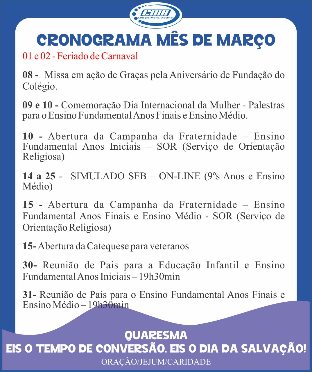 Super User Destaques 08 Março 2022 Acessos: 2204 CRONOGRAMA MÊS DE MARÇO 2022 Por favor, avalie Votar 1 Votar 2 Votar 3 Votar 4 Votar 5 View Comments View the discussion thread. back to top Artigo anterior: Homenagem ao Dia da Mulher - CMA 2022 Anterior Próximo artigo: Homenagem ao Dia da Mulher - CMA Próximo