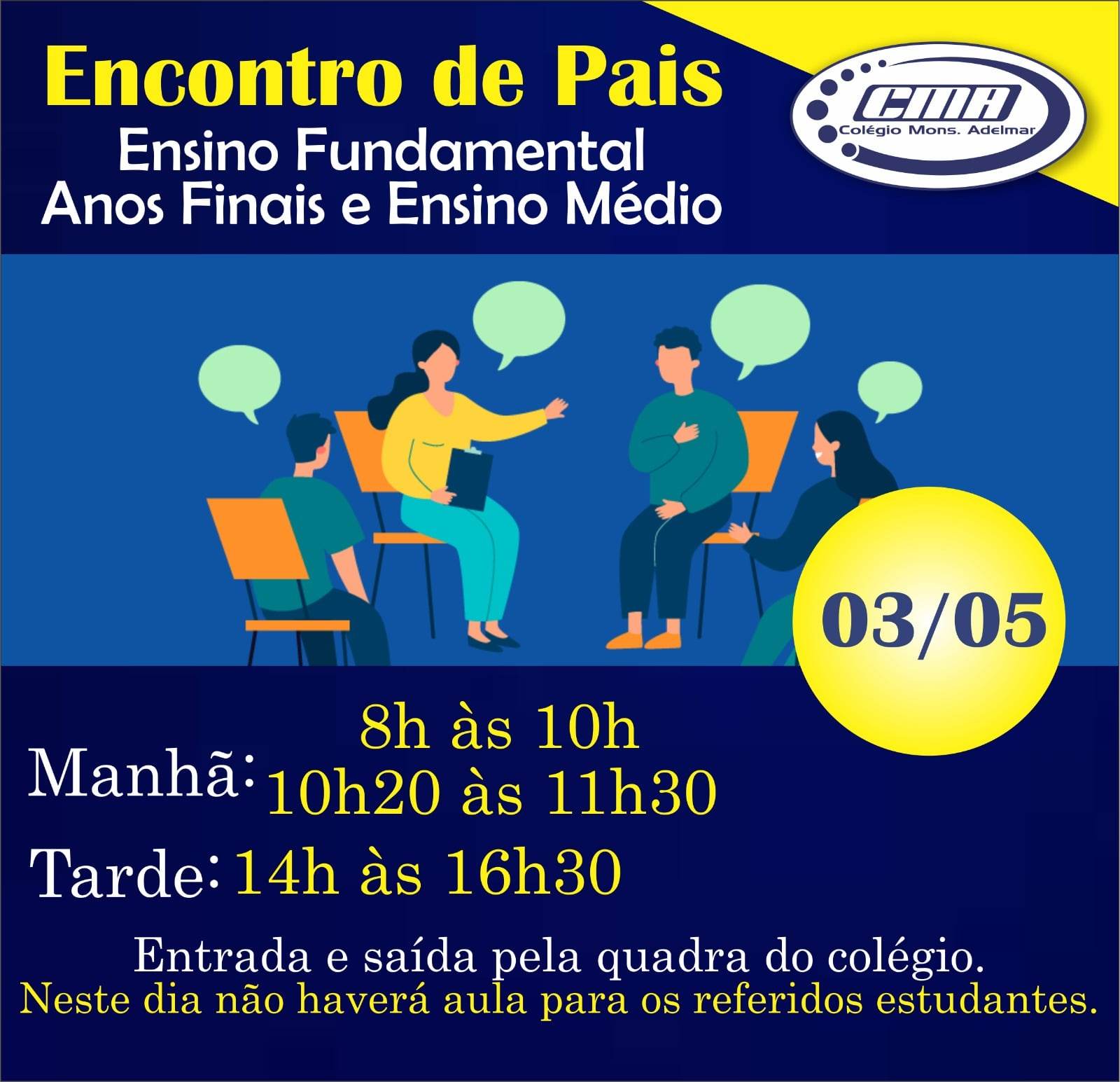 Super User Destaques 28 Abril 2023 Acessos: 1995 Encontro de Pais Fund. Anos Finais e Ensino Médio Por favor, avalie Votar 1 Votar 2 Votar 3 Votar 4 Votar 5 View Comments View the discussion thread. back to top Artigo anterior: CRONOGRAMA MAIO 2023 Anterior Próximo artigo: Encontro de Pais Ed. Infantil e Fund. Anos Iniciais Próximo